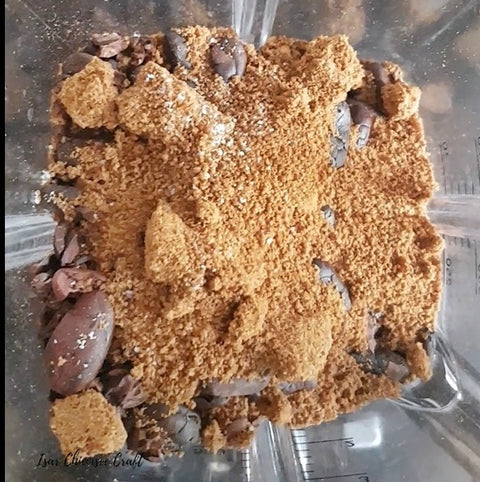 - Gib Bohnen, Butter, Nibs, Pulver, Süssungsmittel und Salz nach und nach in den Mixer und mixe auf niedrigster Stufe, bis die Messer leicht durchdrehen.
