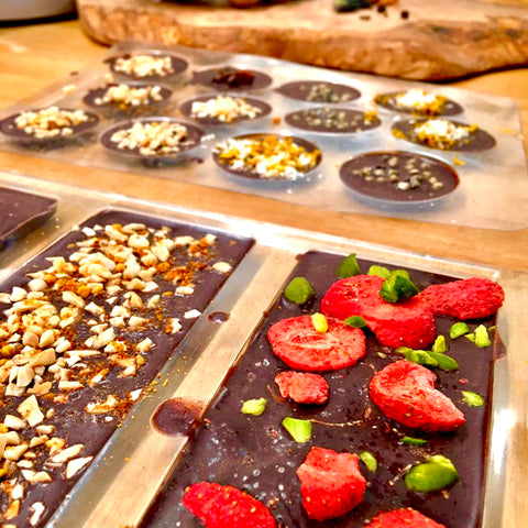 5. Der letzte und beste Schritt besteht darin, die flüssige Schokolade abzufüllen dieser Moment bereitet mir jedes Mal die größte Freude. Du kannst die Tafeln, Reigel, Taler nach Herzenslust mit Toppings wie: SPERMIDINE, Gewürzen, Blüten, Nüssen, Früchten verfeinern.